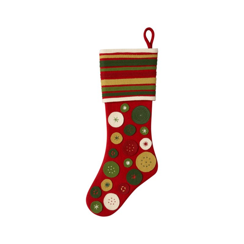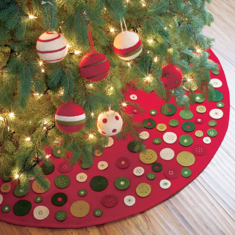 A few years ago I bought a very inexpensive felt Christmas tree skirt. I added my own embellishments with fabric bears and trees cut from my stash, simply added with fusible web. Although I had originally planned to blanket stitch by hand around all the figures, my shortage of time instead led to my using a fine point permanent pen to add a long running "stitch" around the edges of the bears and trees. But it still wasn't very exciting to look at. This year's Crate and Barrel holiday catalog showed lots of crafty type decorations using felt circles, like these stockings and especially the matching tree skirt. I immediately thought of adding circles to my tree skirt, but the idea of cutting out all those suckers sapped my energy. Then, brainstorm, I thought of precut shapes out of felt! Off to Michael's I went and after a whole store search, I located some sparkly snowflakes that were sticky backed--perfect! Two packages came home with me.