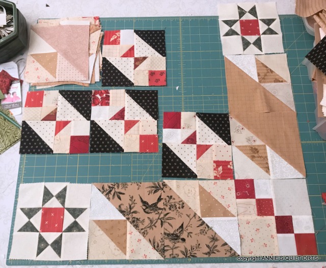 I may invest in one of the small round trimmers as this Olfa mat is getting pretty worn out--I've had it for many years. I did get the HSTs alllll done so I can start sewing them together. The pattern is very simple to assemble.